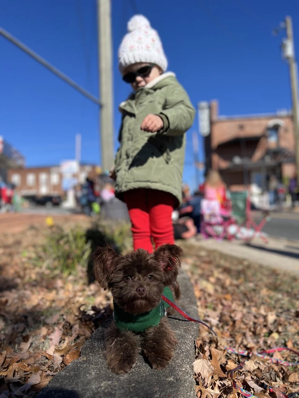 Around the house he is my constant shadow. If I wonder where he has gone he is simply in my blind spot and always by my side. Wether I’m taking care of a baby, cleaning up, doing chores outside, doing office work, cooking dinner, playing with my toddler, Bear is always there and as involved or uninvolved as I want him to be. He follows through with his training reliably and is genuinely a people pleaser. He requires no special accommodations and is a very easy keeper. He has road tripped many times with my family and other dogs, spent numerous nights in hotels, evacuated for hurricanes twice, was always superb for stressful, frantic packing and abrupt departure and has been a great little helper as my demo dog working with clients and other dogs in training. Bear has attended busy downtown parades and festivals and is always a joy.